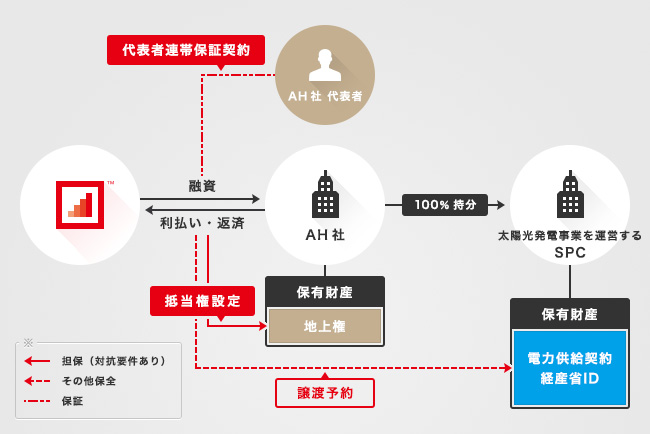 AH社は当該融資に基づく資金を用いて静岡県にある太陽光発電所(FIT価格:36円/kWh)の開発を進めたうえで、開発を進めた太陽光発電所またはその権利関係を売却することで得る資金をもって当該融資の弁済を行う予定です。